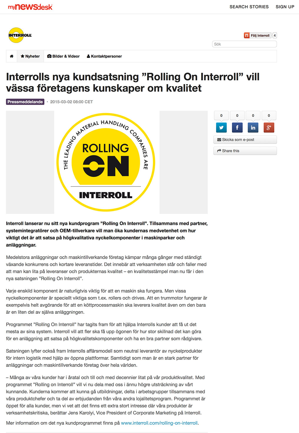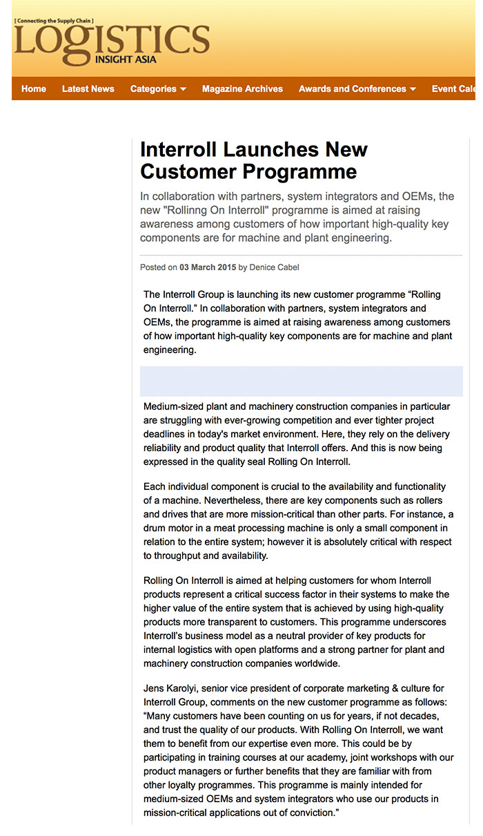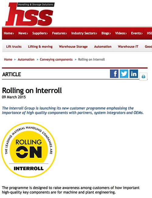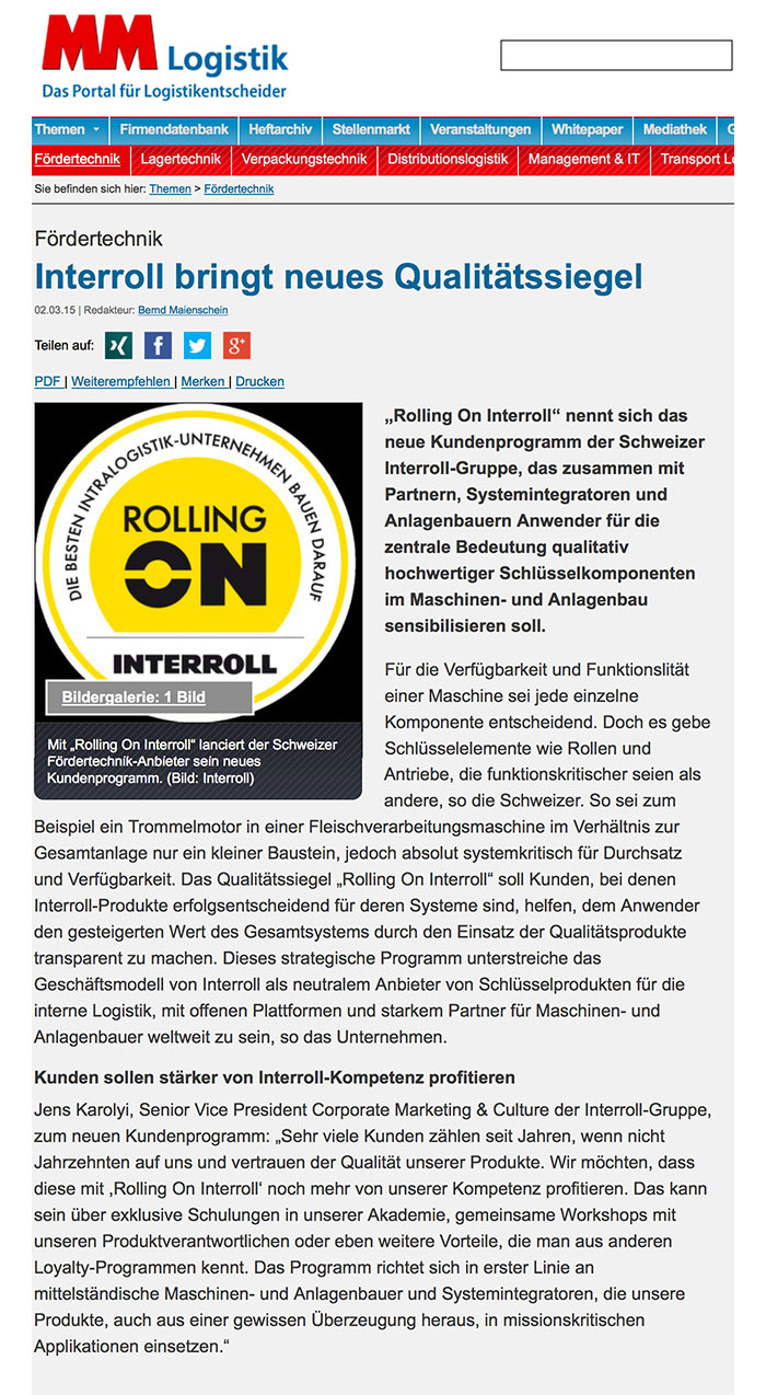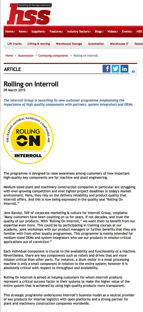 The Rolling On Interroll program was launched this year at the beginning of March on a global scale as a strategic initiative of the Interroll Group.