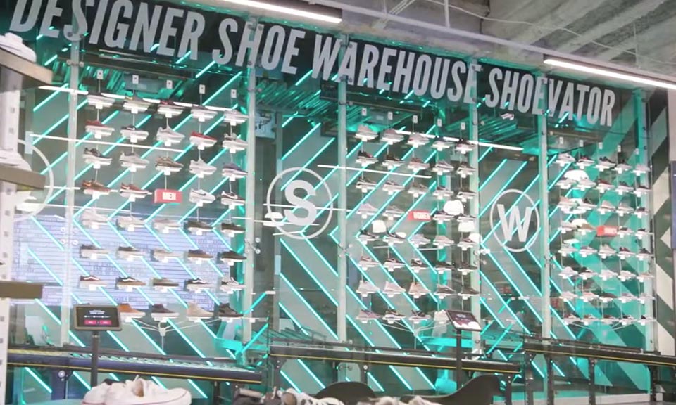 In the flagship store of the Designer Shoe Warehouse, DSW, Rolling On Interroll Partners SourceLink Solutions from Chicago and Qimarox from the Netherlands have created a secret weapon to attract attention. An amazing consumer attraction: the Shoevator™