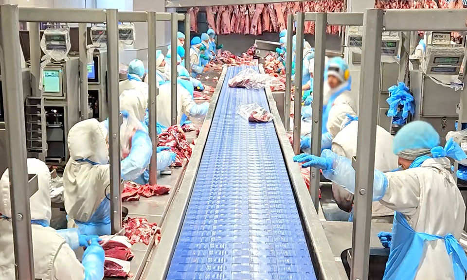Capable of processing, packaging, and palletizing 1800 heads of cattle per day, this impressive, buffered dual storage system turns out 2400 boxes per hour containing products consumed in 50 countries around the world.