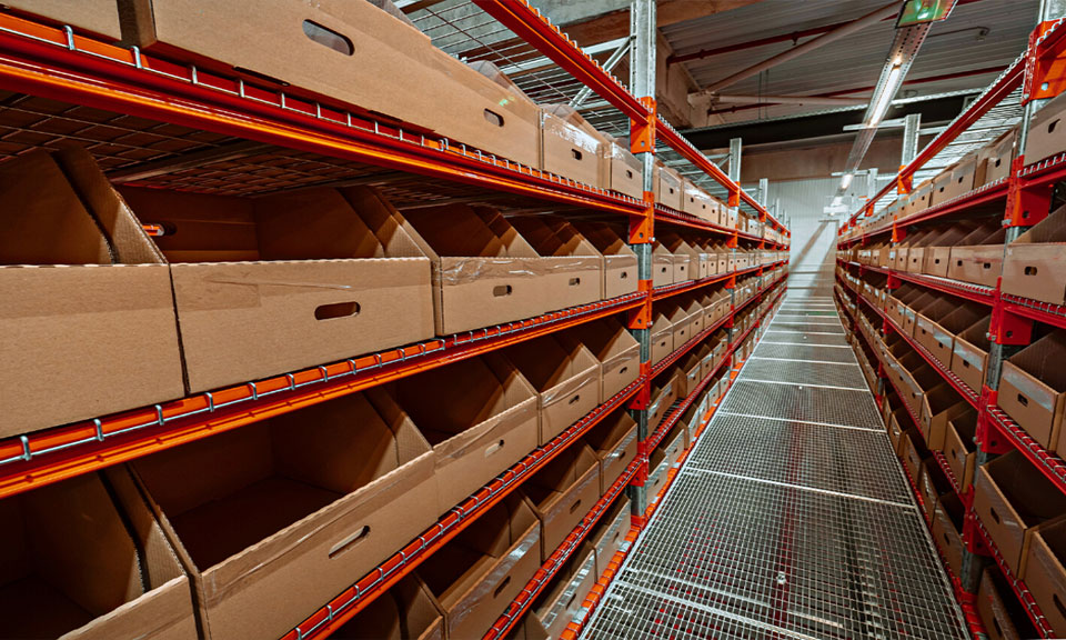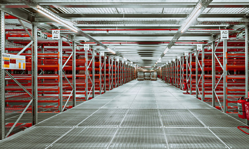 The racking system sprawls over 4 levels, equipped with mezzanines, gangways, industrial lighting and sound systems, and scanning and reading devices.